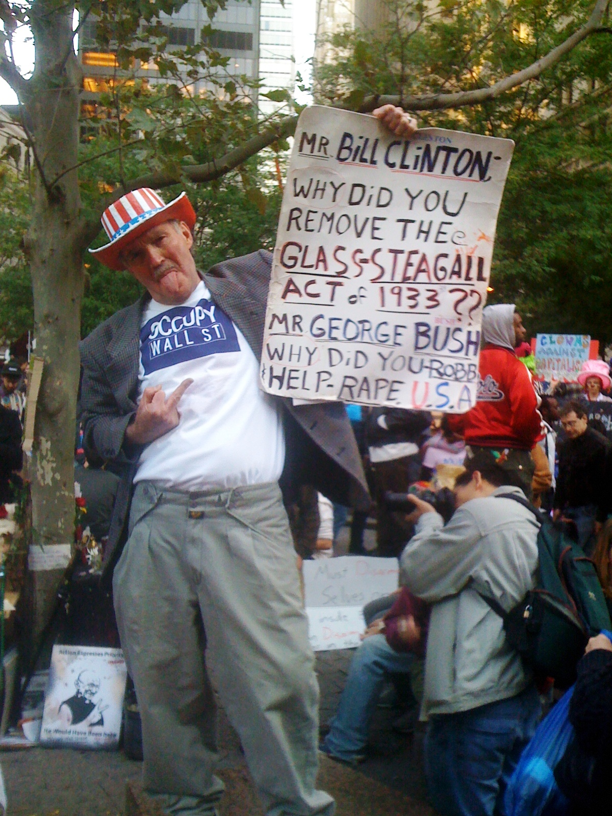 Like the unions in the early 1900s and 1930s and the civil rights and anti-war movements of the 1960s, there has been music and drumming at Wall Street. Even Pete Seeger, the voice and banjo threading the environmental activism of the 80s and 90s to the 60s and the 30s, showed up. Music helps pass the time, helps energize those sitting around and adds to the carnival flavor.